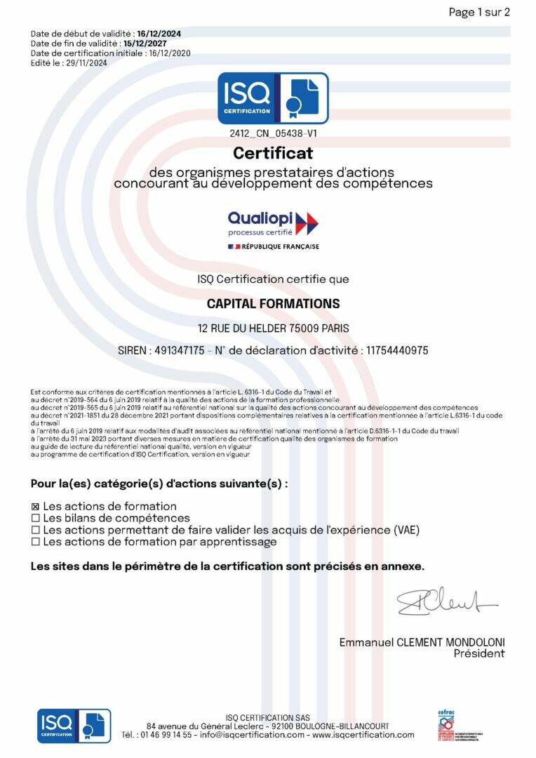 Capital Formations est certifié QUALIOPI depuis 2020 pour les actions de formation avec l’SQ.